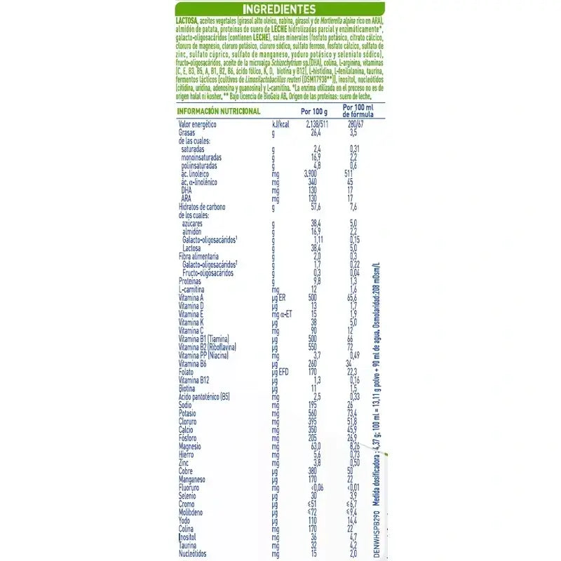 Nestlé NAN TOTAL CONFORT 1 está diseñada para el manejo dietético de trastornos digestivos leves como cólicos o estreñimiento. IngredientesIngredientes: LACTOSA, aceites vegetales (girasol alto oleico, nabina, girasol y de Mortierella alpina rico en ARA), almidón de patata, proteínas de suero de LECHE hidrolizadas parcial y enzimáticamente*, galacto-oligosacáridos (contienen LECHE), sales minerales (fosfato potásico, citrato cálcico, cloruro de magnesio, cloruro potásico, cloruro sódico, sulfato ferroso, fosfato cálcico, sulfato de zinc, sulfato cúprico, sulfato de manganeso, yoduro potásico y seleniato sódico), fructo-oligosacáridos, aceite de la microlaga Schizochytrium sp.(DHA), colina, L-arginina, vitaminas (C, E, B3, B5, A, B1, B2, B6, ácido fólico, K, D, biotina y B12), L-histidina, L-fenilalanina, taurina, fermentos lácticos [cultivos de Limosilactobacillus reuteri (DSM17938**)], inositol, nucleótidos (citidina, uridina, adenosina y guanosina) y L-carnitina.* La enzima utilizada en el proceso no es de origen halal ni kosher.** Bajo licencia de BioGaia AB.Origen de las proteínas: suero de leche
