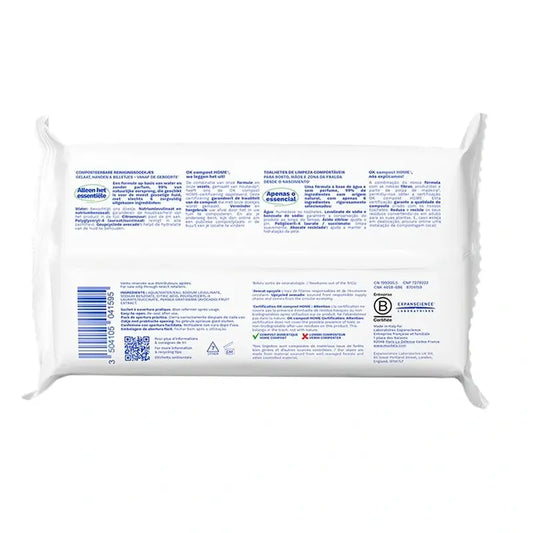 Los componentes activos son: celulosa obtenida de forma sostenible, polipropileno y poliéster. La loción es hecha con agua pura (mínimo 97 % de agua), ácido cítrico, citrato de sodio,caprílico o triglicérido caprílico, combinado con aceite hidrogenado de castor, goma xantana, dimethicone,benzoato sódico, EDTA disódico y caprilato de sorbitán.