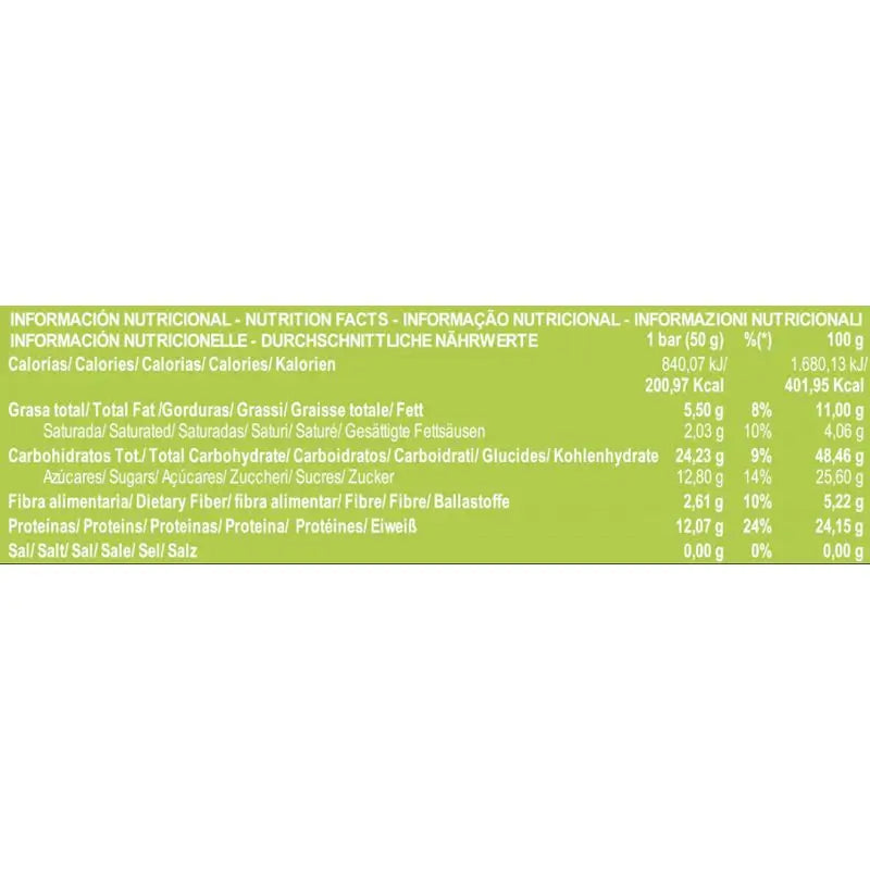 Proteína (12 g), Dátiles (49,7%), clara de huevo deshidratada (24%), plátano deshidratado (13%), limón deshidratado, avellanas (10%), aceite de oliva virgen extra y aroma natural de plátano.