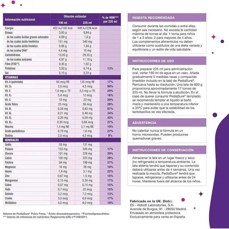 PediaSure es un complemento alimenticio que contiene nutrientes de los 5 grupos de alimentos como 13 vitaminas y 14 minerales incluyendo hierro, calcio y vitamina D. La vitamina D les ayuda con sus defensas, y el calcio y las proteínas le apoya con el desarrollo de sus huesos.