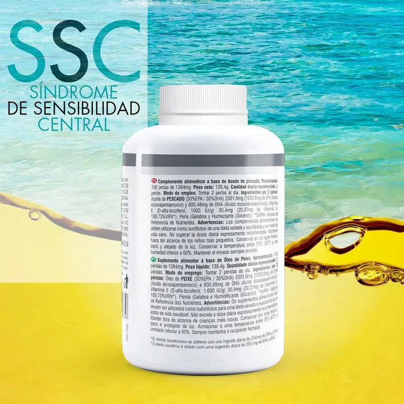 Ingredientes por 2 perlas: Aceite de PESCADO (50% EPA/30%DHA) 2001,6 mg [1000,8 mg de EPA (Ácido eicosapentaenoico) y 600,48 mg de DHA (Ácido docosahexaenoico)], Vitamina E (D-alfa-tocoferol, 1000 UI/g) 30,4 mg (20,37 mg de Vitamina E, 169,73%VRN*). Perla (Gelatina bovina y humectante (glicerol)). * %VRN: Valores de Referencia de Nutrientes.