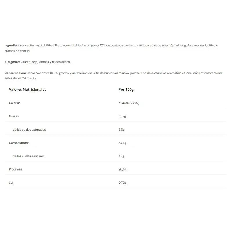 https://www.farmaciasdirect.es/products/protella-protella-american-cookie-crema-choco-avellana-250gPR8414172611209Protella Protella American Cookie Crema Choco-Avellana 250GLa Crema de Chocolate con Avellana de Protella es una delicia para untar o rellenar tus postres. Con sabor a chocolate y avellana, es el acompañamiento perfecto para tus recetas dulces.ComposiciónAzúcar, aceite de palma, avellanas (13%), leche desnatada en polvo (8%), cacao en polvo (7%), leche entera en polvo (7%), cacao en polvo desgrasado (5%), emulsionante (lecitina de soja), aroma, antioxidante (E304, E306).Modo de empleoUnta en tostadas o crêpes, o úsala como relleno.Consejo farmacéuticoEvita el exceso de consumo para mantener un equilibrio dietético.https://www.farmaciasdirect.es/cdn/shop/files/protella-protella-american-cookie-crema-choco-avellana-250g.webp?crop=center&height=300&v=1725062549&width=300https://www.farmaciasdirect.es/cdn/shop/files/protella-protella-american-cookie-crema-choco-avellana-250g.webp?crop=center&height=100&v=1725062549&width=1007.197.990.810.01