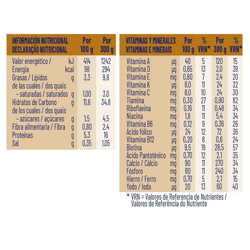 Agua, pollo (10%), pasta alimenticia de trigo (6%), maltodextrina, champiñones (3,6%), tomates, almidón modificado de maíz, leche en polvo (2,5%), proteína de soja, cebollas, aceite de oliva (1,2%), mantequilla, aromas (contiene lactosa y apio), espesante (goma xantana), emulgentes (ésteres de los mono y diglicéridos de los ácidos grasos, lecitina de soja), minerales (citrato cálcico, fosfato cálcico), vitaminas (C, A, B3, E, B5, D, B1, K, B2, B12, B6, B9 y B8), especias, acidulante (ácido cítrico), antioxidante (ácido ascórbico) y potenciadores del sabor (E-621, E-627).
