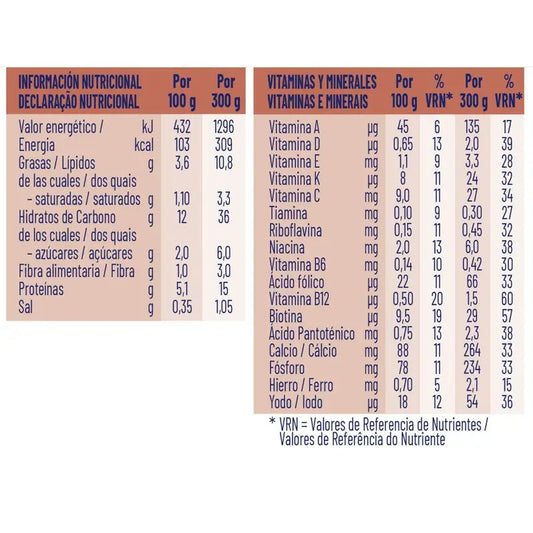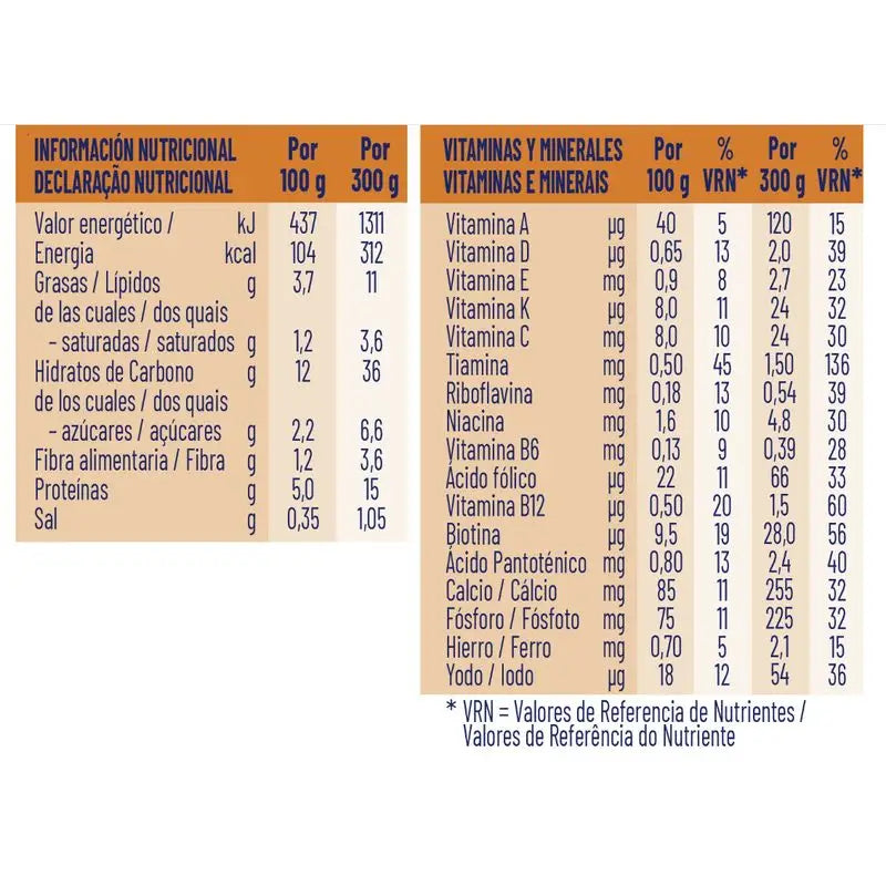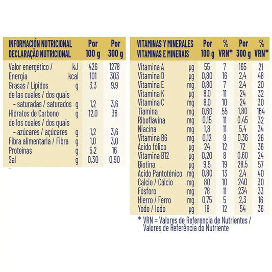 Agua, zanahorias (25%), pavo (10%), maltodextrina, cebollas, apio, leche en polvo, harina de arroz (2,4%), aceite de oliva (2,1%), tomates (2%), almidón modificado de maíz, proteína de soja, aromas (contienen lactosa y apio), emulgentes (ésteres de los mono y diglicéridos de los acidos grasos y lecitina de soja), minerales (citrato cálcico, fosfato cálcico), espesante (goma xantana), vitaminas (C, A, B3, E, B5, D, B1, K, B2, B12, B6, B9 y B8), ajo, especias, antioxidante (ácido ascórbico) y potenciador de sabor (E-621, E-627).