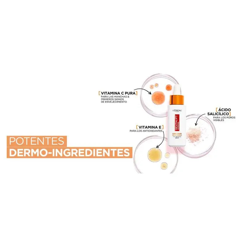 https://www.farmaciasdirect.es/products/revitalift-clinical-serum-arrugas-tono-poros-con-12-de-vitamina-c-pura-vitamina-e-acido-salicilicoLO3600524069773L'Oréal Paris Revitalift Clinical Sérum [Arrugas-Tono-Poros] Con 12% De Vitamina C Pura + Vitamina E + Ácido Salicílico.Di adiós a los signos de la edad con el nuevo Sérum Revitalift Clinical formulado con Vitamina C pura, que reduce los signos del envejecimiento y aporta luminosidad, ácido salicílico que ayuda a reducir los poros y alisar la piel, y vitamina E que protege la piel del estrés oxidativo.Ingredientes909366 3 - INGREDIENTS: AQUA / WATER • ASCORBIC ACID • DIMETHICONE • GLYCERIN • ALCOHOL DENAT. • POTASSIUM HYDROXIDE • POLYSILICONE-11 • PENTAERYTHRITYL TETRAETHYLHEXANOATE • ACETYL DIPEPTIDE-1 CETYL ESTER • ADENOSINE • SODIUM HYALURONATE • TOCOPHEROL • SILICA • AMMONIUM POLYACRYLOYLDIMETHYL TAURATE • BUTYLENE GLYCOL • CAPRYLYL GLYCOL • C13-14 ISOPARAFFIN • HYDROXYETHYLCELLULOSE • LAURETH-7 • PEG-20 METHYL GLUCOSE SESQUISTEARATE • POLOXAMER 338 • POLYACRYLAMIDE • SORBITAN LAURATE • XANTHAN GUM • BIS-PEG/PPG-16/16 PEG/PPG-16/16 DIMETHICONE • CAPRYLIC/CAPRIC TRIGLYCERIDE • PENTAERYTHRITYL TETRA-DI-T-BUTYL HYDROXYHYDROCINNAMATE • SALICYLIC ACID • PARFUM / FRAGRANCE (F.I.L. Z70013603/1).Características- 55% - líneas de expresión- 53% - tono desigual- 59% - poroshttps://www.farmaciasdirect.es/cdn/shop/files/revitalift-clinical-serum-arrugas-tono-poros-con-12-de-vitamina-c-pura-vitamina-e-acido-salicilico.webp?crop=center&height=300&v=1732620693&width=300https://www.farmaciasdirect.es/cdn/shop/files/revitalift-clinical-serum-arrugas-tono-poros-con-12-de-vitamina-c-pura-vitamina-e-acido-salicilico.webp?crop=center&height=100&v=1732620693&width=10021.3928.16.7123.88