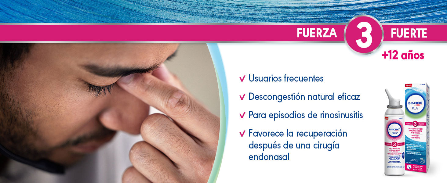 Rhinomer Plus 3 Fuerza Fuerte: Agua de mar hipertónica con Algomer Complex 100% natural, para episodios frecuentes de sinusitis. Spray Nasal de 125 ml con fuerza fuerte para adultos y niños a partir de 12 años.