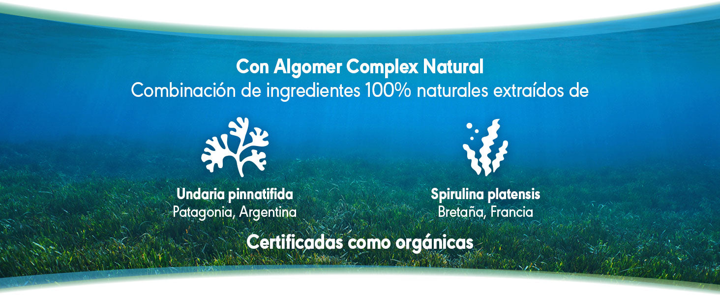 Agua de mar (equivalente a 2,3% NaCl), Agua purificada, Complejo de algas (extractos de Undaria pinnatifida y Spirulina platensis). 100% natural.