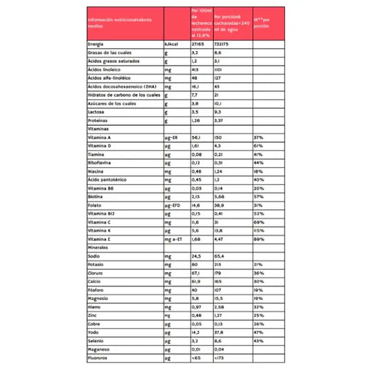 (leche), minerales (fosfato tricálcico, sulfato de manganeso, cloruro