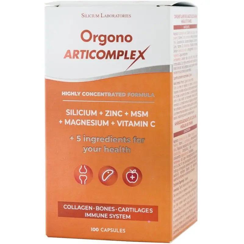 https://www.farmaciasdirect.es/products/silicium-orgono-articomplex-100-capsulasSI8437006679466Silicium Orgono Articomplex , 100 cápsulasOrgono Articomplex es un suplemento natural en forma de cápsulas que está diseñado para mejorar la salud de las articulaciones y los huesos. Contiene una combinación de ingredientes naturales que ayudan a reducir la inflamación, aliviar el dolor y promover la regeneración de los tejidos articulares. Este producto es ideal para personas que sufren de problemas articulares como la artritis, la artrosis o lesiones deportivas. Su fórmula única proporciona nutrientes esenciales para fortalecer los huesos y mejorar la movilidad.Modo de empleoEl modo de empleo de Orgono Articomplex es tomar 2 cápsulas al día, preferiblemente con las comidas. Se recomienda tomarlas con un vaso de agua. Es importante seguir las indicaciones del fabricante y consultar a un profesional de la salud antes de comenzar cualquier suplemento.IngredientesIngredientesMagnesio (carbonato y óxido), silicio (ácido silícico, Orgono® Powder), vitamina C (ácido L-ascorbido), metilsulfonilmetano, zinc (gluconato de zinc), manganeso (gluconato de manganeso), cobre (gluconato de cobre), vitamina D3 (colecalciferol), cromo (picolinato de cromo), selenio (selenito sódico). Excipientes: estearato de magnesio (antiaglomerante). Cápsula vegetal. Proporciona 15 mg de Silicio elemental por 2 cápsulas equivalente a 51,42 mg de ácido silícico de máxima absorción.https://www.farmaciasdirect.es/cdn/shop/files/silicium-orgono-articomplex-100-capsulas.webp?crop=center&height=300&v=1725066562&width=300https://www.farmaciasdirect.es/cdn/shop/files/silicium-orgono-articomplex-100-capsulas.webp?crop=center&height=100&v=1725066562&width=10033.339.876.5716.48