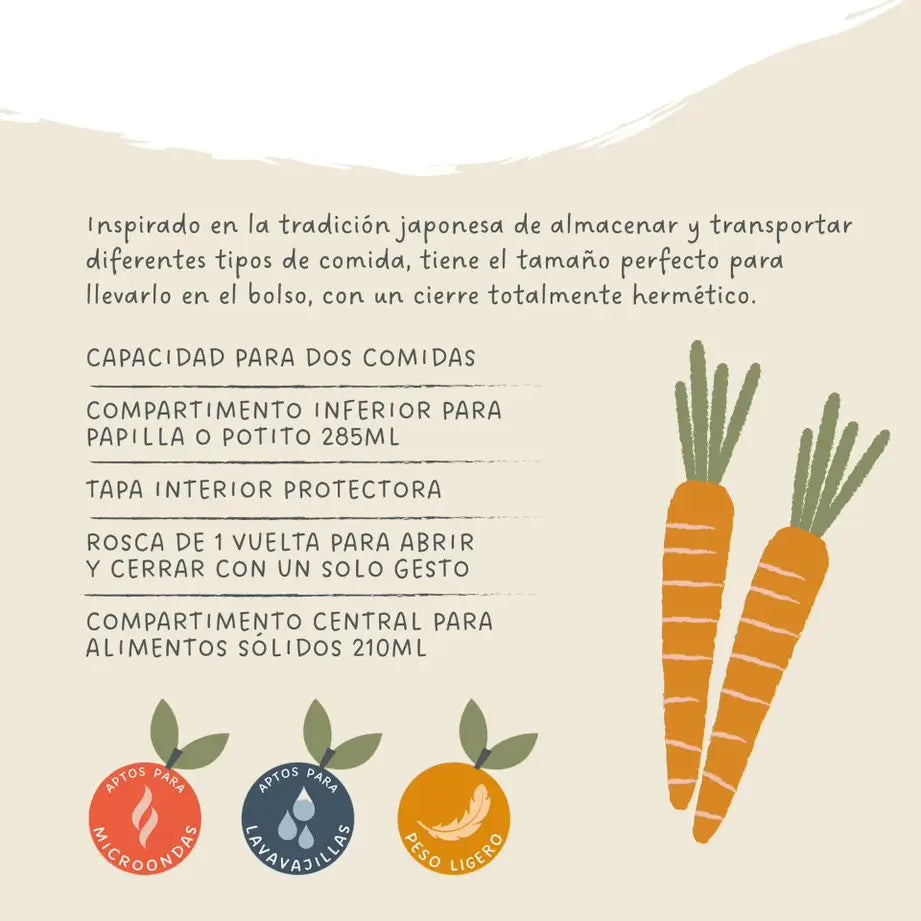 Bento Box de Suavinex. Set de 2 Platos Combinables con capacidad para transportar hasta 2 platos de comida. ¡Ideal para llevar en el bolso y dar de comer al bebé en cualquier lugar! En el compartimento inferior se puede transportar la papilla o el potito (capacidad de hasta 285ml) y en el compartimento central los alimentos sólidos (capacidad de hasta 210ml). Gracias a su tamaño podrás sujetarlo con una sola mano y dejar la otra libre para dar de comer al bebé cómodamente.