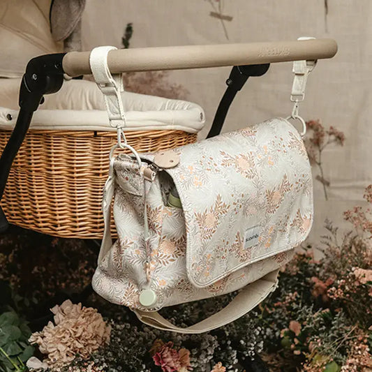 El bolso de maternidad pequeño estampado de la colección Wonderland de la gama Selection de Suavinex es una opción compacta pero muy espaciosa, ideal para la silla de paseo. El formato Panera es ideal para llevar bien organizados en la silla de paseo los imprescindibles del bebé: biberón, pañales, toallitas, cremas, pequeños juguetes... Dimensiones: 42 cm de ancho, 26 cm de alto y 12 cm de fondo y capacidad de 13,10 litros. La composición del bolso en la parte exterior es de 100% algodón OEKO-TEX con tratamiento waterproof, lo que lo hace resistente al agua y fácil de limpiar. El interior es 100% poliéster. Para mantener el bolso en las mejores condiciones, se recomienda limpiarlo con un paño húmedo. No debe lavarse a máquina, ni a mano, y es importante no usar lejía. No lavar en seco y no planchar. Dispone de 5 bolsillos interiores: tres bolsillos pequeños sencillos ideales para objetos pequeños, un bolsillo más grande con cremallera y un bolsillo térmico con goma para sujetar objetos, ideal para transportar biberones, papilleros o tarritos de pie sin que se vuelquen. Cuenta también con 3 bolsillos exteriores: uno pequeño con solapa de imán y dos bolsillos laterales grandes con capacidad para biberones, botellas de agua, tarritos o toallitas. El bolso tiene dos cintas textiles con broches metálicos a presión para colgar del manillar de la silla de paseo y una asa larga para colgar del hombro. Los mosquetones metálicos permiten poner y quitar el asa fácilmente, y el cierre de cremallera proporciona mayor seguridad. Además, el bolso tiene ranuras interiores para esconder las cintas que se cuelgan del manillar cuando quieras utilizarlo como bolso de hombro.