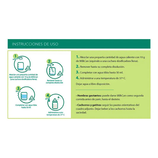 Sustituye a la leche materna ya que incorpora de manera equilibrada todos los nutrientes que la lactancia natural aporta. Lactación de gatitos huérfanos o rechazados por la madre, ayuda a la lactancia en camadas numerosas, insuficiente producción de leche o mala calidad de ésta, suplemento alimenticio para hembras en gestación o lactación, fortalecimiento de animales de edad avanzada o enfermos.