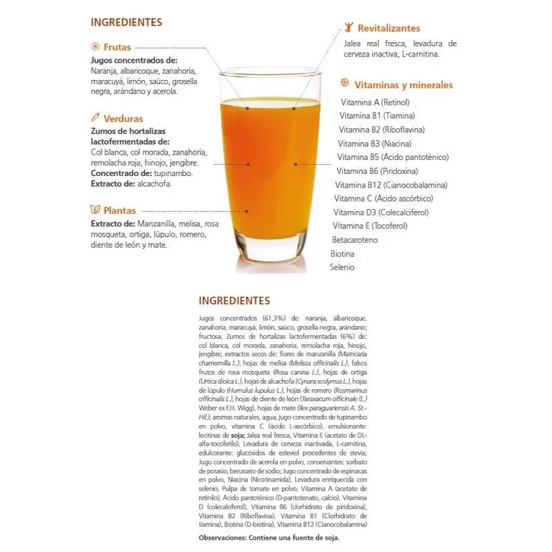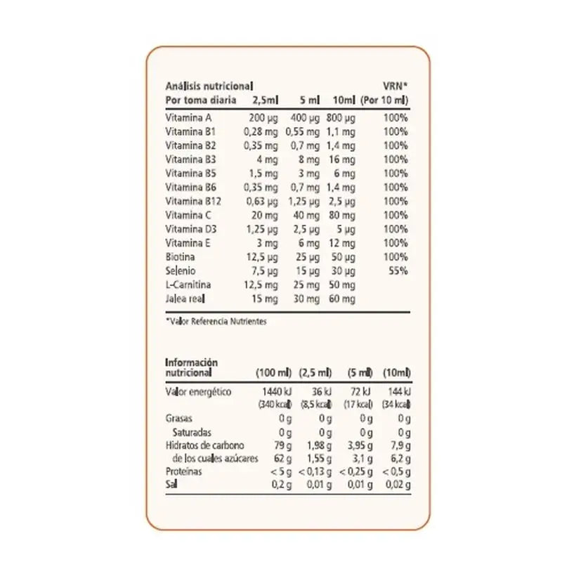 El multivitamínico Vibracell con jalea real CoQ10 es un concentrado con edulcorante y con más de 40 frutas y verduras. Tiene un alto contenido en vitamina A, B, C y E, biotina, ácido fólico y selenio. Está formulado para ayudar a minimizar el cansancio y la fatiga. Además, contribuye al metabolismo energético normal.